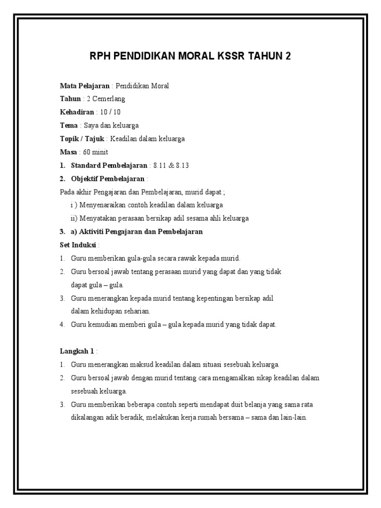 Menghargai dan memuliakan seseorang. Saya Sayang Diri Saya Impak. RPH Pendidikan Moral Tahun 2 adalah Rancangan Pengajaran Harian yang perlu disediakan lebih awal oleh guru sebelum menjalankan sesi pegajaran dan pembelajaranRancangan Pengajaran Harian ini dibina sebagai panduan para guru untuk mengajar dengan lebih sistematik dan efektif serta mampu untuk mencapai apa yang.