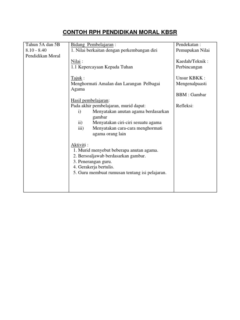 7262019 contoh RPH Pendidikan Moral Tahun 4 KSSR. Contoh Rancangan Harian Pendidikan Moral KSSR TAHUNMASA PERKARA CATATAN SUBJEK Tahun 1 Tema. RPH Pendidikan Moral Tahun 6 adalah Rancangan Pengajaran Harian yang perlu disediakan lebih awal oleh guru sebelum menjalankan sesi pegajaran dan pembelajaran.